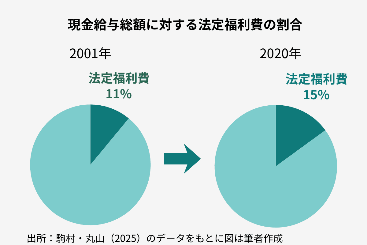 企業の法定福利費(会社負担の社会保険料など)は、現金給与総額に対する割合で見ると、2001年以降おおむね増え続けています。駒村・丸山(2025)が取りまとめたデータを見ると、2001年には給与総額の11%程度だった法定福利費が、2020年にはおよそ15%まで上昇しました。