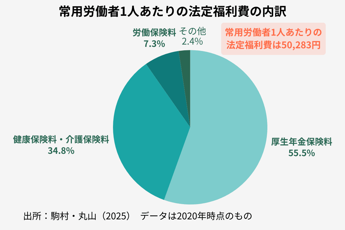 常用労働者1人あたりの法定福利費の平均額は、2020年時点で月50,283円です。内訳を見ると、