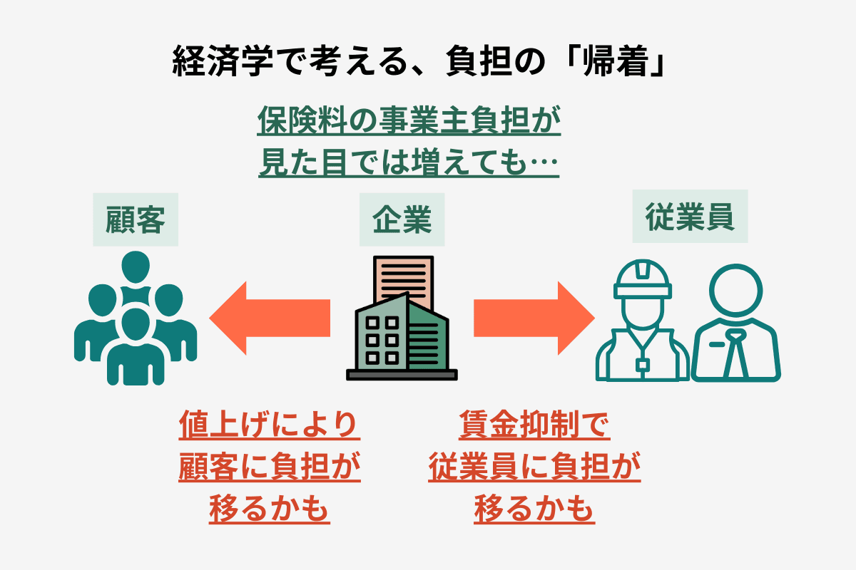 例えば、企業の保険料支払いが増えてしまったとしましょう。それでも、保険料の支払いを商品の価格に上乗せできれば、顧客へと負担が帰着していると考えられるでしょう。事業主が支払う保険料の分だけ賃金の伸びを抑えていれば、保険料の負担は労働者に帰着していると言えます。