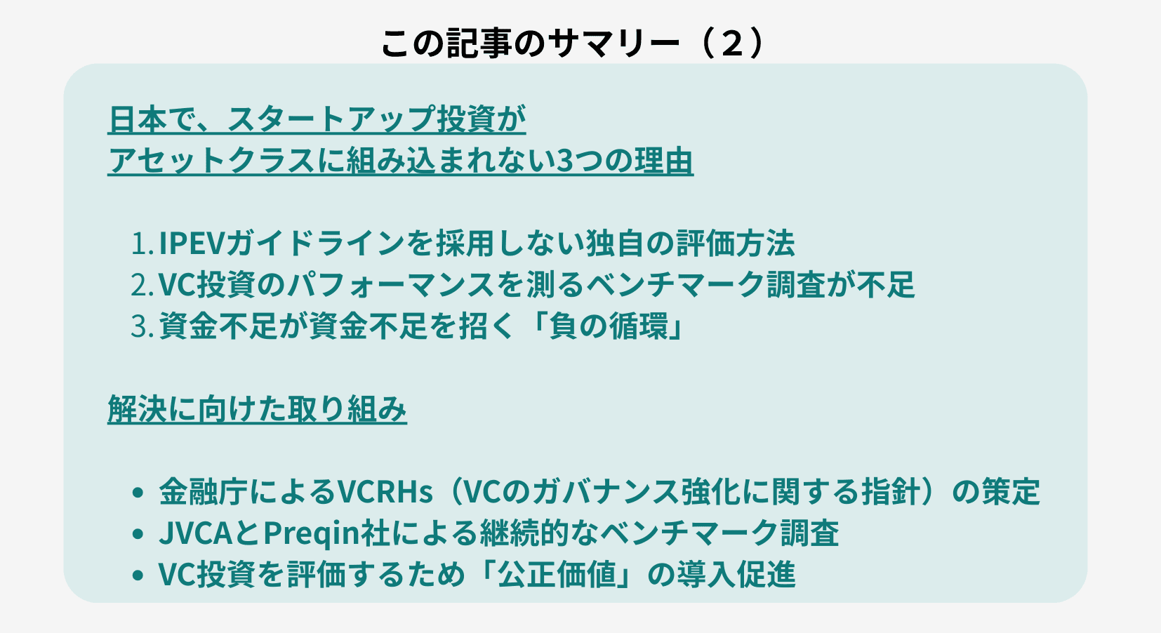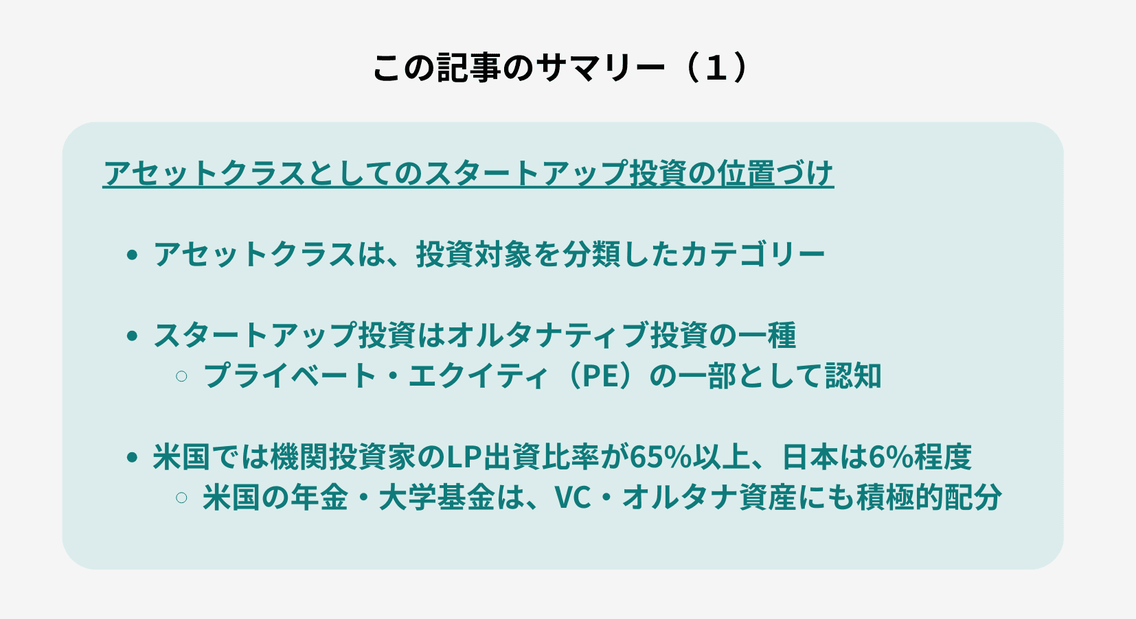 この記事では、日本においてスタートアップ投資がアセットクラスの一部として確立されない現状と、改善に向けた取り組みについて解説しました。