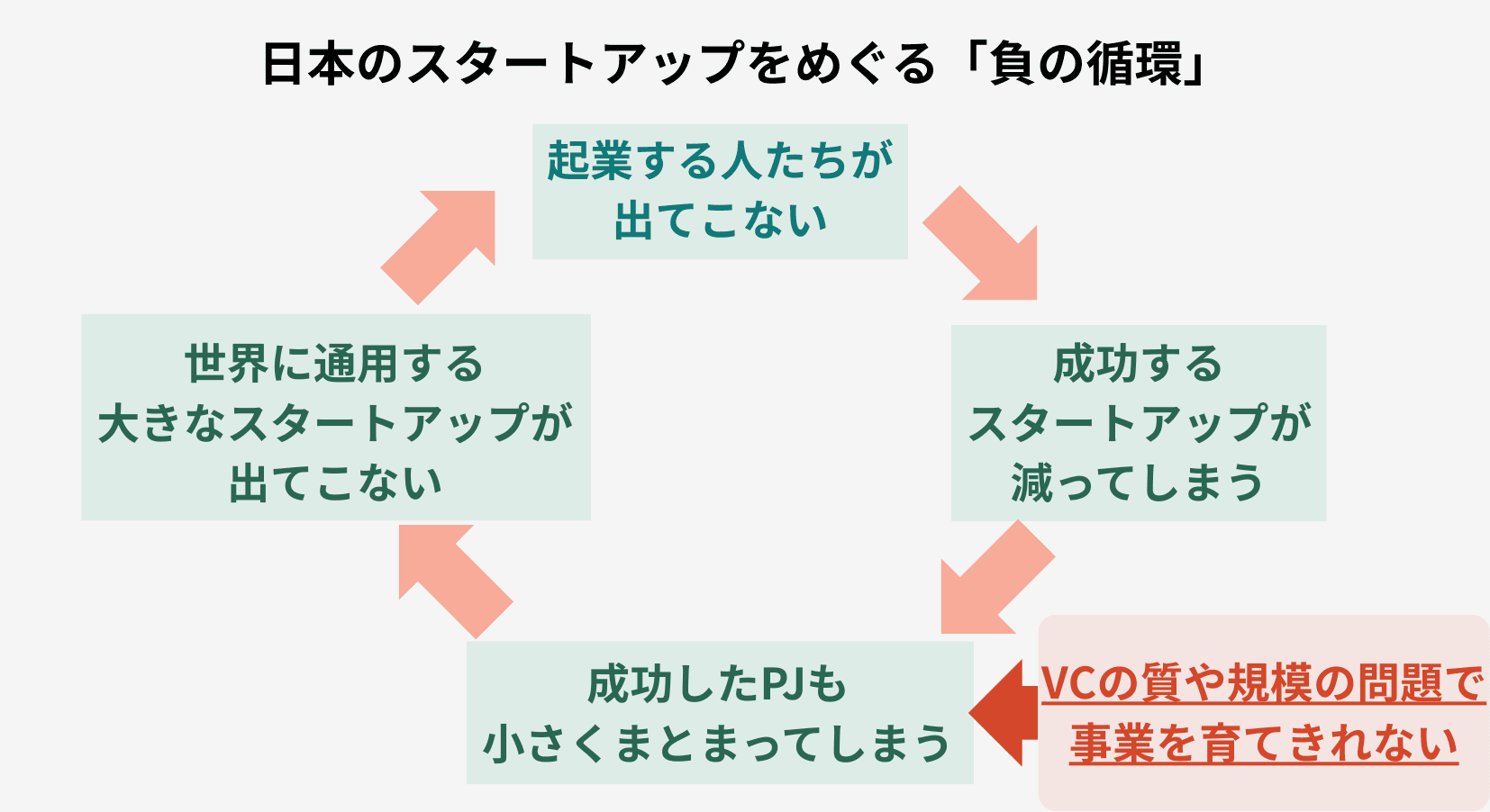 3つ目の理由は、機関投資家からの資金が流入せず、さらなるVCの資金不足を招く「負の循環」が生じる点です。