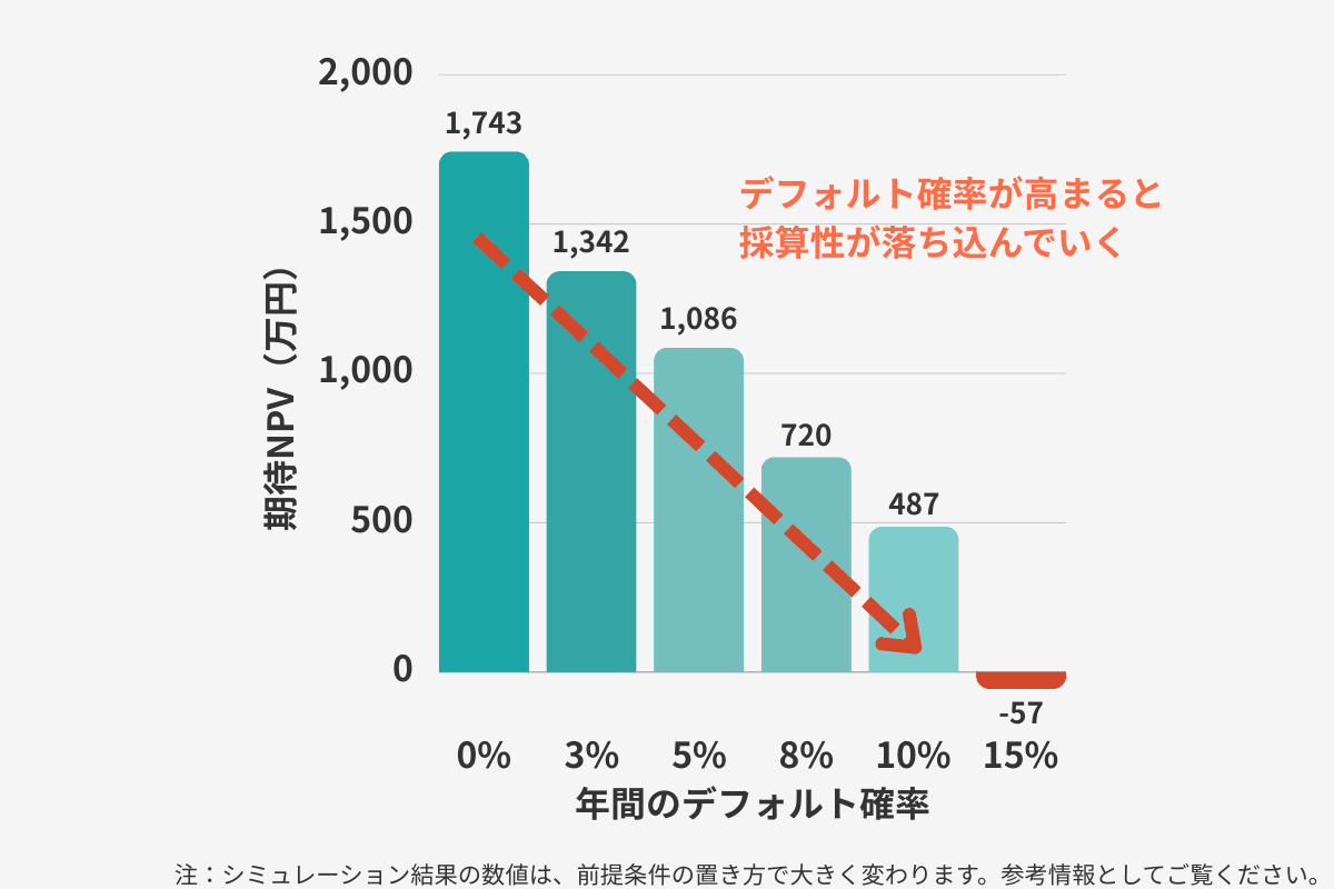 また表を見る限り、「デフォルトは想定しない」という楽観的な前提は危ういです。 デフォルト確率0%の期待NPVは1,743万円と魅力的に見えますが、この数字はリスクを一切織り込んでいません。実際にデフォルトが発生すれば、利益は急速に小さくなってしまいます。