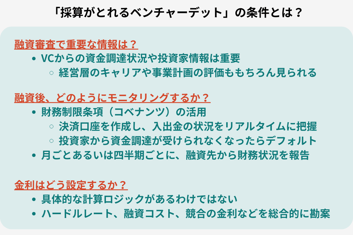 これらの収益要素を合わせたうえで、ベンチャーデットが「採算のとれる商品」であるかどうかを、どのように定量的に判断すればよいのでしょうか。